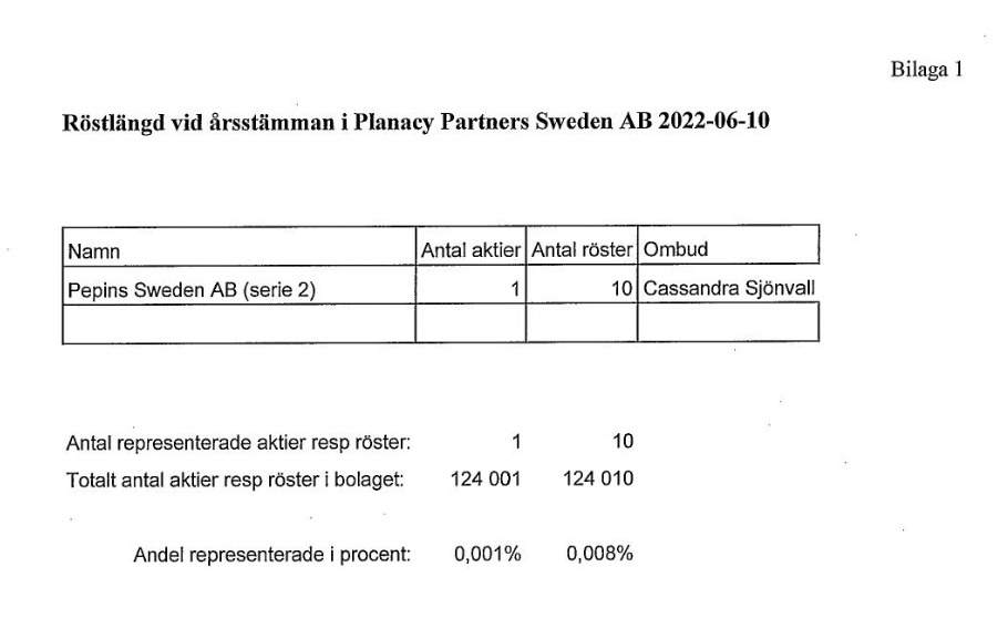 De flesta av våra protokoll som vi analyserar från Bolagsverket kommer från "extra bolagsstämmor", som t.ex. vid en nyemission. Men ibland får vi också in protokoll från årsstämmor. Vid årsstämmor finns inga krav på närvaro hos aktieägarna och ibland kan röstlängderna som upprättas till och med se ut så här: