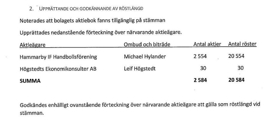 Här ser vi till och med explicit i texten att aktieboken fanns tillgänglig vid stämman, men att det ändå är de närvarande aktieägarna som bildar röstlängden. I detta fall fall vet vi baserat på data från Bolagsverket att samtliga aktier inte är listade i röstlängden, men vi för ändå in den data vi ser. Därmed har vi sett ett exempel på hur ett bolag inte har 100% ägande i vår databas.