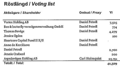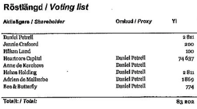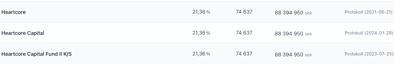 Som ni ser förekommer “Heartcore” i flera olika varianter i de olika protokollen. Både våra modeller och vi som jobbar med datakvalitet gör vad vi kan för att upptäcka dessa fall och försöka komma fram till att “Heartcore”, “Heartcore Capital” och “Heartcore Capital Fund II K/S” egentligen är samma aktör. Men, för det första uppstår denna problematik dagligen i 100-tals dokument. För det andra är det svårt att veta helt säkert att de “tre” aktörerna egentligen är en och samma. Notera även exemplet med “Anne de Kerchova”, som förekommer på protokollet från 2024. Visst kan vi vara 99% säkra på att det är samma person som “Anne De Kerckhove” från protokollet från 2023, men vi kan aldrig vara riktigt 100% säkra. När sedan aktierna ska summeras i en tabell hos Eivora kan det så tyvärr se ut så här: