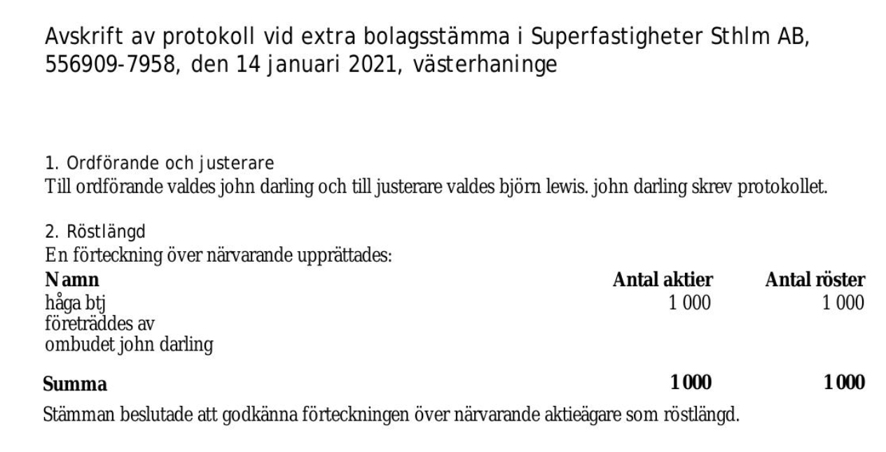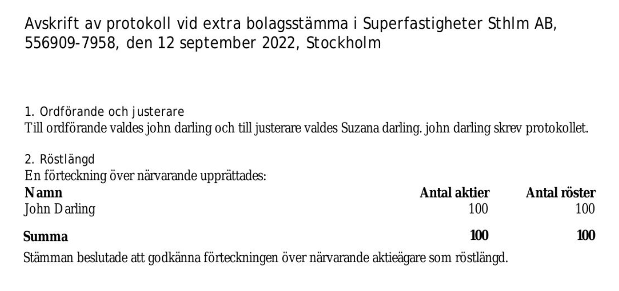 Ibland när vi går igenom flera protokoll som tillhör samma bolag noterar vi att ägandet verkar växla mellan en privatperson och ett bolag som kontrolleras av samma privatperson. Det finns ju såklart möjligheten att ägandet de facto växlar fram och tillbaka mellan en personen och bolaget, men kanske ofta kan vi konstatera att det rör sig om otydlighet eller slarv. Låt oss titta på ett exempel.